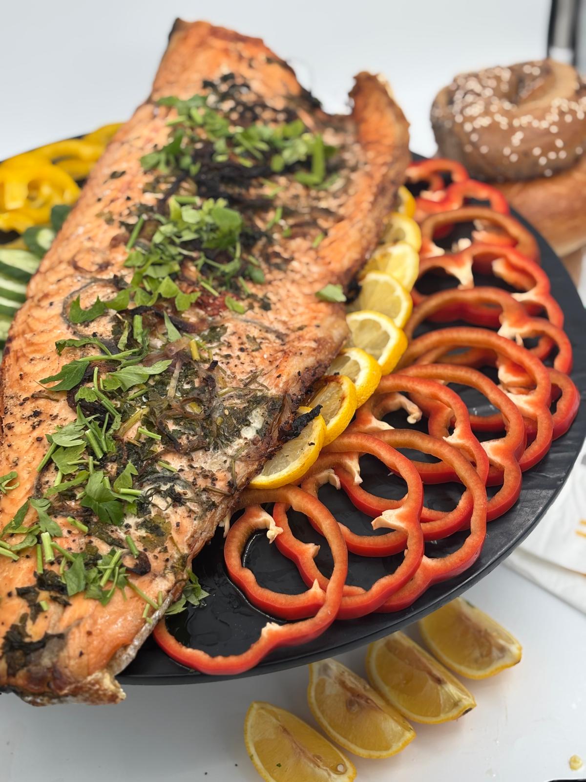 נתח פילה סלמון אפוי בתנור בטיבול מיוחד על מצע של ירקות המוגש קר.