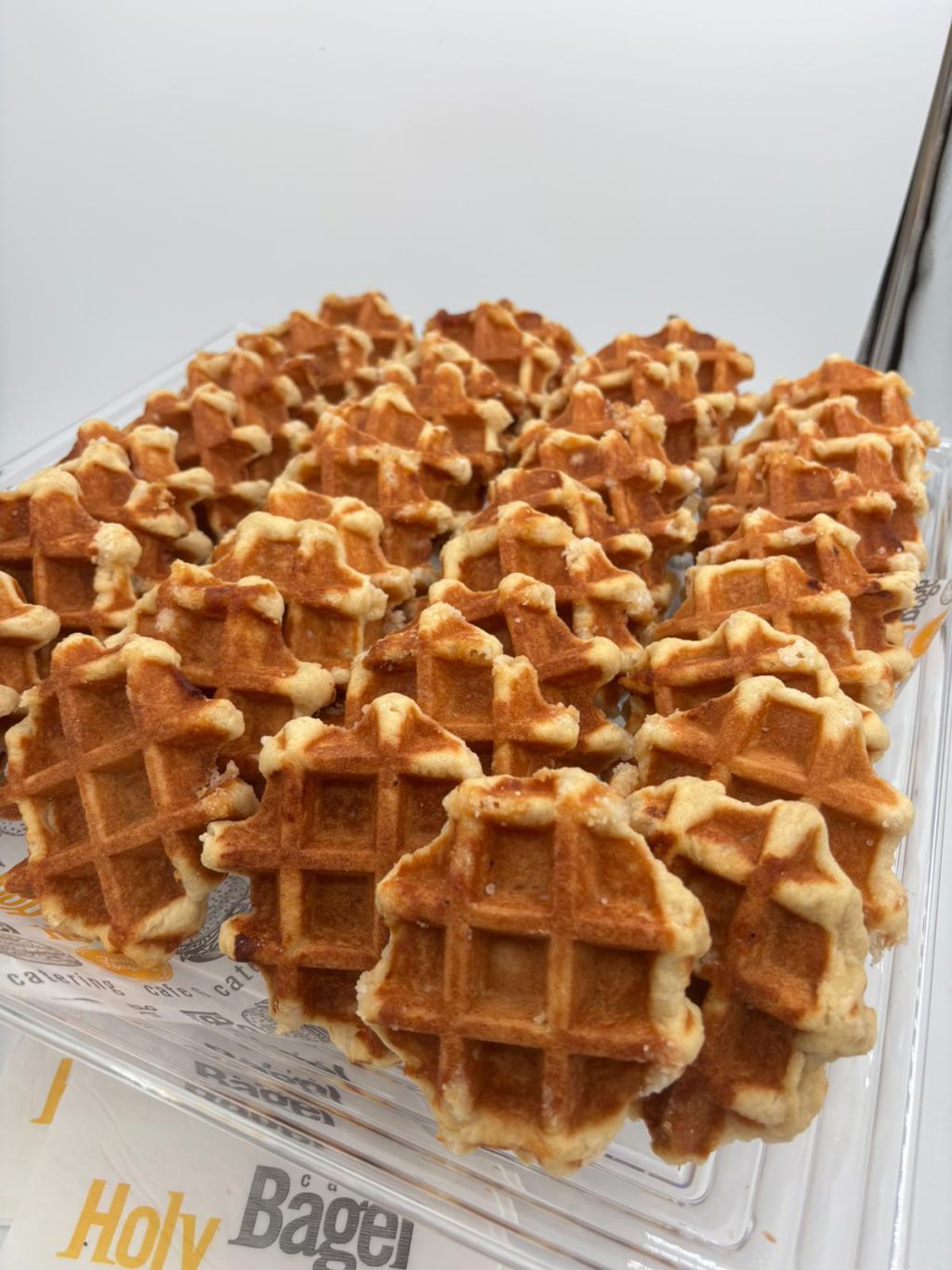 ארבעים יחידות של וופל בלגי מוכן לאכילה עם רטבים.